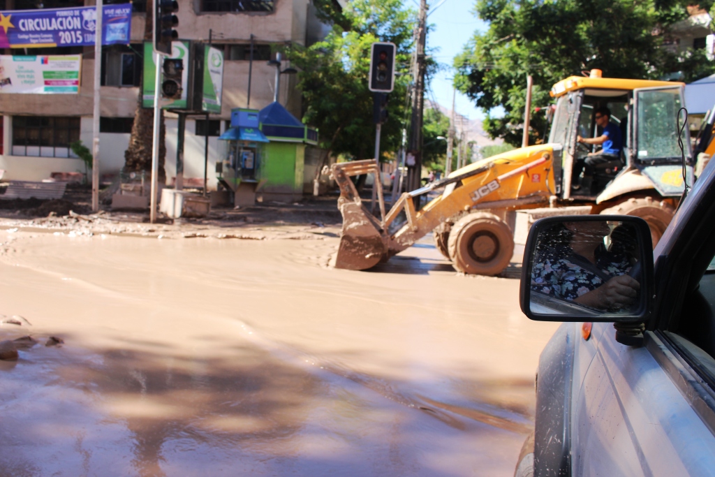 Envalentonados seguimos ruta hacia Copiapó, una ciudad minera que había recibido de lleno la furia de las quebradas. Empezamos a cruzar camionetas cubiertas de barro y contingentes de militares con tanques incluidos en distintos puntos de la ruta anunciando el desastre. Se iba la luz cuando llegamos pero la noche no pudo ocultar un escenario dantesco. Una Venecia de barro se desplegaba por donde mirases. Salpicando lodo y rezando para no empantanarnos empezamos a buscar el Convento de las Dominicas. No habíamos podido comunicarnos con ellas para avisarles que llegábamos ese día. Había sectores de la ciudad sin luz y otras, poco iluminados. Pudimos ver casas con más de un metro de barrio, personas caminando sin rumbo con mirada perdida con el barro a la rodilla, autos ahogados y plazas nevadas de nieve marrón. Circulaban soldados y carabineros en camioneta y a caballo para evitar saqueos y ordenar un poco el tránsito que sin semáforos ni reglas circulaba como hormigas. Preguntamos y nos mandaron hacia el centro. Pasamos la plaza de armas y un boulevard que debía haber sido muy lindo con casas de colores ahora mimetizadas por el barro. Paramos al lado de una grúa y los conductores que milagrosamente tenían señal de teléfono nos dieron las coordenadas para llegar. Era en la otra punta.