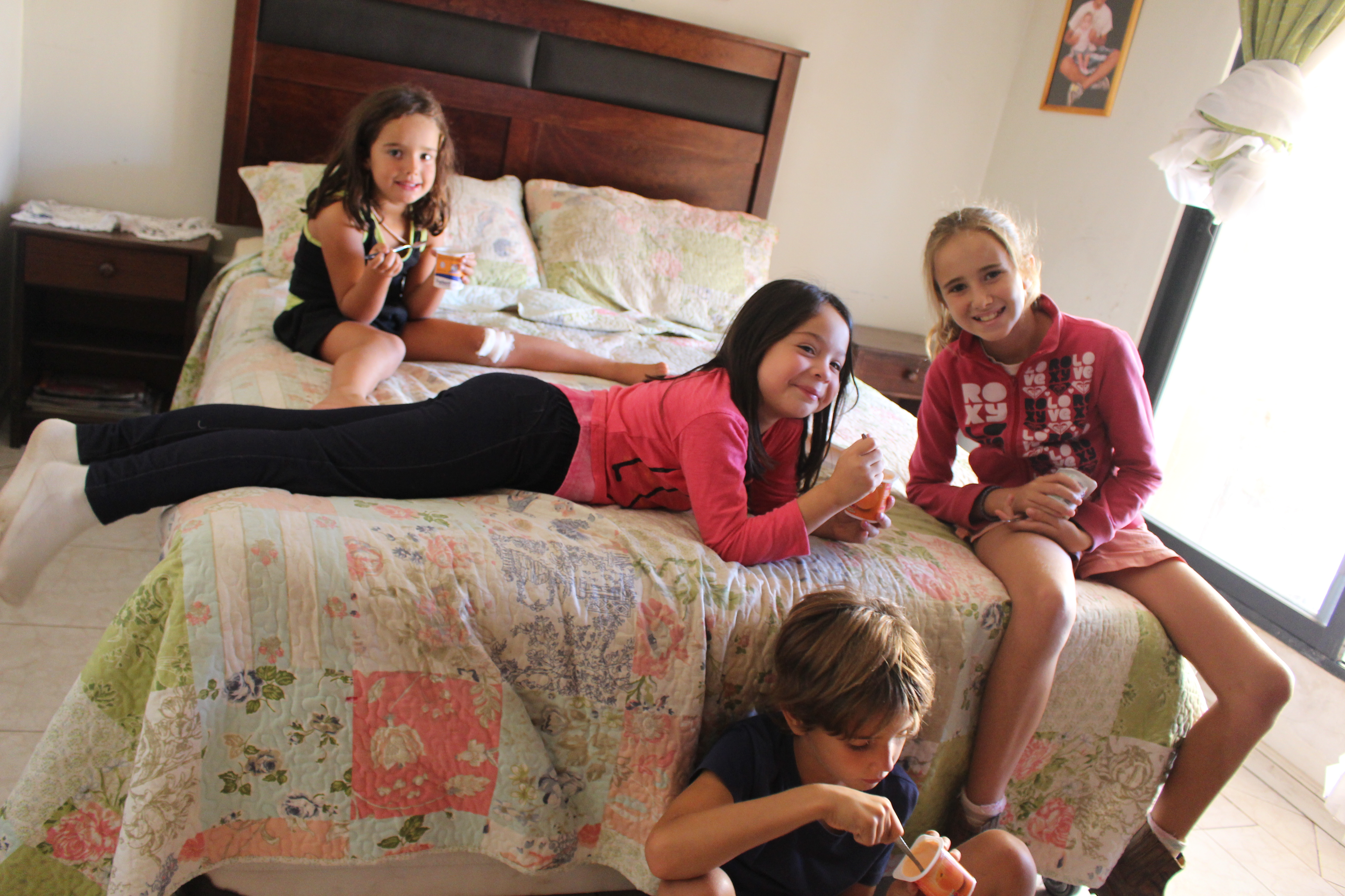 En el medio del caos, y en ese oasis, nosotros pudimos conectarnos a Internet, compartir la mesa con la familia, y los chicos estudiar y entretenerse con sobrinas (nuevas grandes amigas), los gatos de Norma (matriarca de la familia), la cama de Angela que servía para ver tele y hacer pruebas (con pata rota incluida, de la cama no de un chico– papelón), y dormir siestas. Angela encima encontró hueco para llevarnos a dar una vuelta por la ciudad y visitar la colección de autos antiguos que tiene uno de sus hermanos. Pasamos cuatro días en esa casa gracias a que algún miembro de la familia nos buscaba y devolvía al monasterio religiosamente.