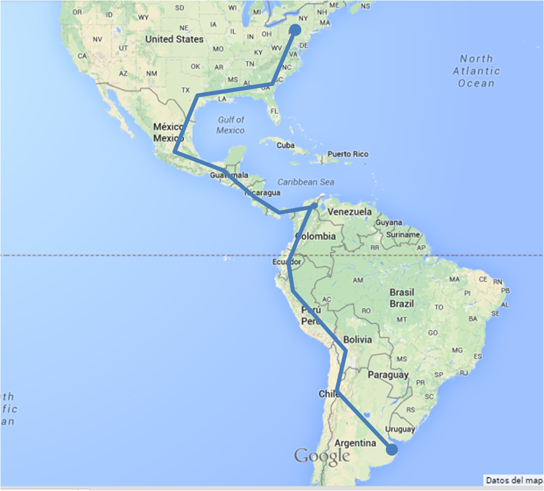 Buenos Aires – Philadelphia: Salimos de Buenos Aires hacia Mendoza. Cruzamos a Chile y por el Pacífico subimos a Perú, Ecuador, Colombia. En Cartagena cruzamos por agua hastá Colón, Panamá. Cruzamos Centro América, México y entramos a Estados Unidos por el este.